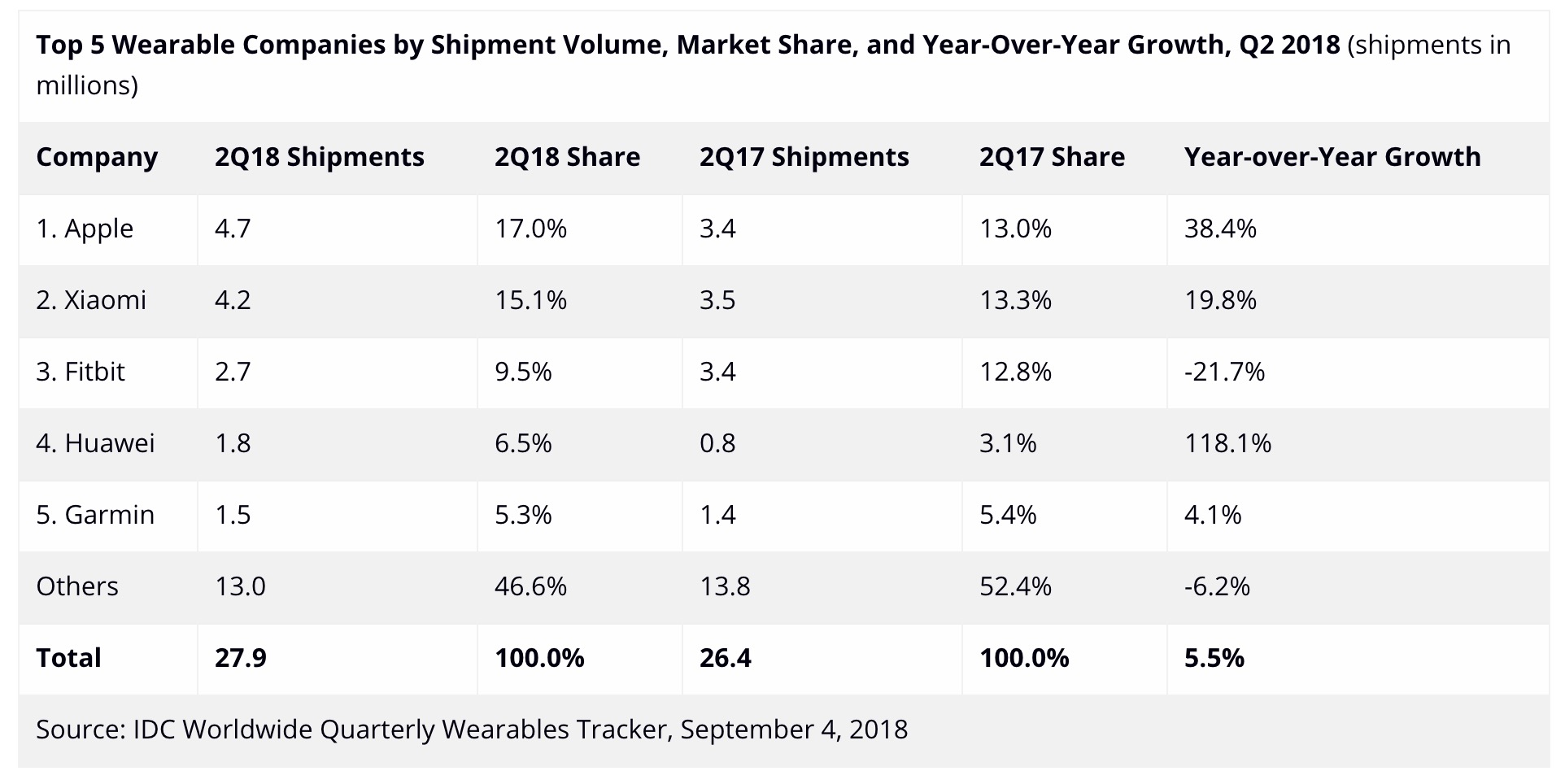 Xiaomi est arrivée en deuxième position avec 4,2 millions d’unités vendues, ce qui représente une amélioration par rapport aux 3,5 millions d’unités enregistrées il y a un an, suivi de Fitbit, qui est tombé à 2,7 millions d’unités au cours de ce trimestre. La performance de Fitbit est un peu inattendue étant donné que la gamme comprend de nouveaux modèles et que sa part de marché est passée de 12,8 % à 9,5 %.
