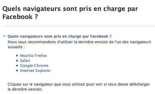 Il s’agit certainement d’une question de stratégie de conception. Soyons honnêtes, Internet Explorer, Firefox et Opera sont de bons navigateurs, mais nombreux sont ceux qui conviennent également que Safari et Chrome sont tout aussi bons, sinon meilleurs, et conviennent parfaitement à la navigation sur Facebook !