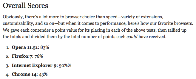 Depuis que Facebook est si fortement dépendant du JavaScript, il figure que la vitesse de chargement des pages serait le facteur le plus important sur l’utilisation du réseau social. Lifehacker a fait des tests en fin d’année dernière, et ces derniers ont montré que Chrome a surpassé les trois navigateurs ci-dessus dans cette métrique :