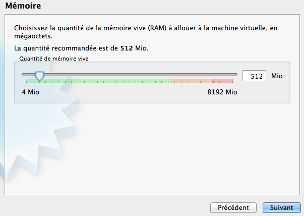 - 5 – Réglez ensuite au moins à 512 Mo la mémoire vive, mais ce n’est pas nécessaire. Cliquez sur “Suivant”