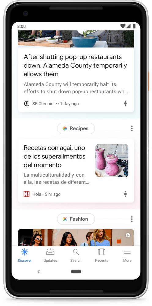 Discover apporte également un support multilingue, à commencer par l’anglais et l’espagnol. Si vous avez tendance à lire les nouvelles en espagnol, mais tout le reste en anglais, Google prendra note, et fournira les suggestions appropriées.