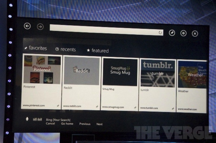 En effet, Internet Explorer sur la Xbox 360 ressemble à n’importe quelle autre application que l’on peut retrouver sur la console ou le prochain Windows 8. Tout votre contenu est délégué à des blocs qui représentent des pages Web. Vous pouvez les faire défiler en utilisant des commandes vocales ou un appareil mobile, et ce grâce au Smart Glass. Les pages Web peuvent être explorées à l’aide du dispositif mobile, comme si la tablette était un trackpad sur un ordinateur portable.