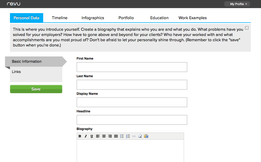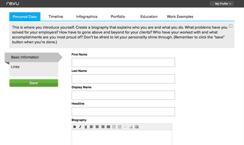 La première chose que vous allez faire une fois que vous vous êtes inscrit au service et que vous avez obtenu votre compte Re.vu, va être d’importer vos informations LinkedIn, après quoi vous pouvez commencer à ajouter manuellement les détails supplémentaires que vous souhaitez partager avec des potentiels employeurs. Vous pouvez ajouter une biographie, téléchargez votre CV “traditionnel” et ajouter une photo de profil. Vous pouvez également ajouter des liens vers vos blogs, sites personnels et autres comptes en ligne, y compris Twitter, Facebook, Google+, Flickr et plus…