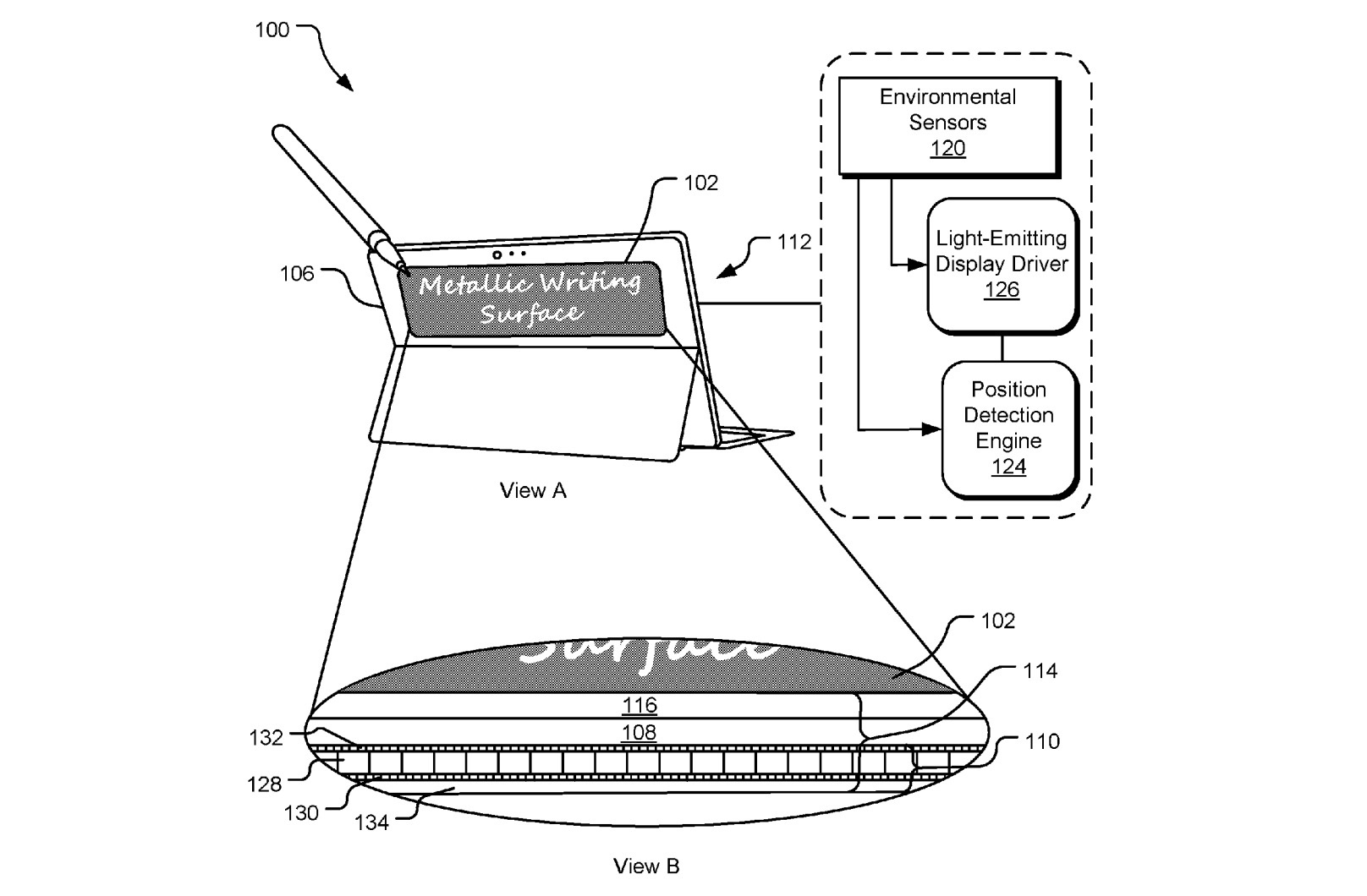 Techniquement, cela pourrait avoir de nombreuses applications et Microsoft décrit plusieurs scénarios dans son brevet. Celui qui a le plus de chances d’être réellement utile implique que l’écran à l’arrière serve de zone d’écriture, ce qui permet techniquement d’utiliser la Surface même lorsque le capot est fermé.