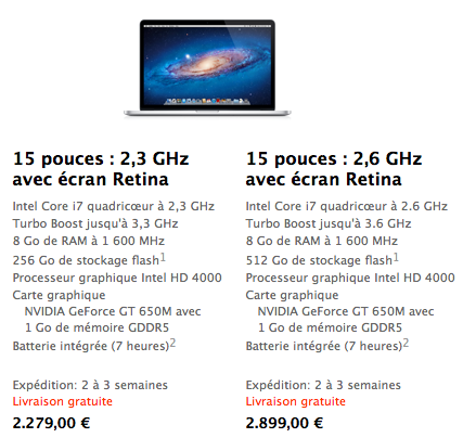 La gamme du MacBook Pro a également été revue intégrant des processeurs Ive Bridge. Ils arboreront des processeurs Intel jusqu’à un Core i7 quad-core cadencé à 2,7 GHz. Le MacBook Pro 15″ va avoir ses performances graphique améliorées.