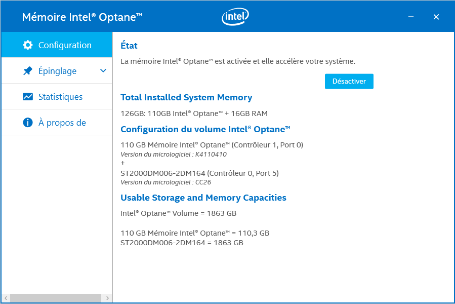 - Accélérateur de système : Intel Optane 800p de 128 Go