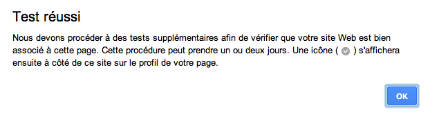 Cette petite attention de la part de Google arrive comme un lien “officiel” vers votre page Google+, de sorte que les utilisateurs du moteur qui sont susceptibles d’être intéressés pourront trouver facilement de l’information. Une coche sera également visible sur votre page Google+ à côté du lien que vous avez inséré pour voir l’avancée d’acception de celui-ci :