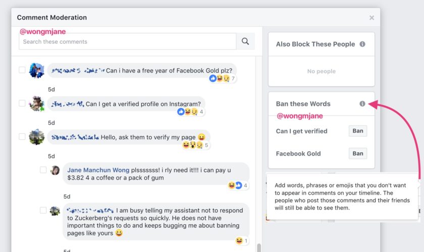 La fonctionnalité fait partie d’un outil de modération de contenu qui permet également aux utilisateurs de bloquer les commentaires des autres utilisateurs. Wong a déclaré que cette fonctionnalité était destinée aux fils d’actualités personnelles et non aux pages professionnelles. S’il est lancé, l’outil rejoindra les options existantes, telles qu’un filtre antispam pour les commentaires.