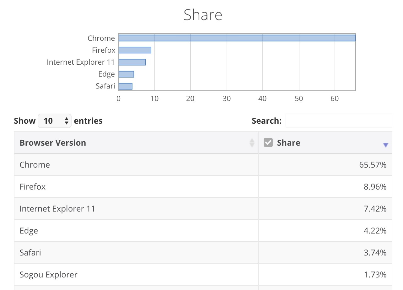Tout d’abord, c’est Chrome. Le navigateur de Google a chuté à 65,57 % le mois dernier, mais comme vous pouvez le constater, il fonctionne toujours sur près de 7 ordinateurs de bureau sur 10. Ensuite, il s’agit de Mozilla Firefox, qui a également baissé de 9,25 % à 8,96 % en un mois seulement. Troisièmement, Microsoft Edge est passé de 4,28 % à 4,22 % de parts de marché, tandis qu’Internet Explorer, le navigateur qui ne reçoit plus les mises à jour de fonctionnalités mais uniquement les correctifs de sécurité, a une part de marché de 7,42 %.