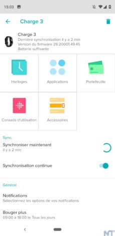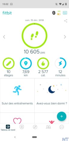 J’ai testé le Charge 3 avec l’application Android, mais elle est également disponible sur iOS. Dans l’écran d’accueil de l’application, vous trouverez cinq onglets principaux : Tableau de bord, Défis, Conseil, Communauté et Notifications.