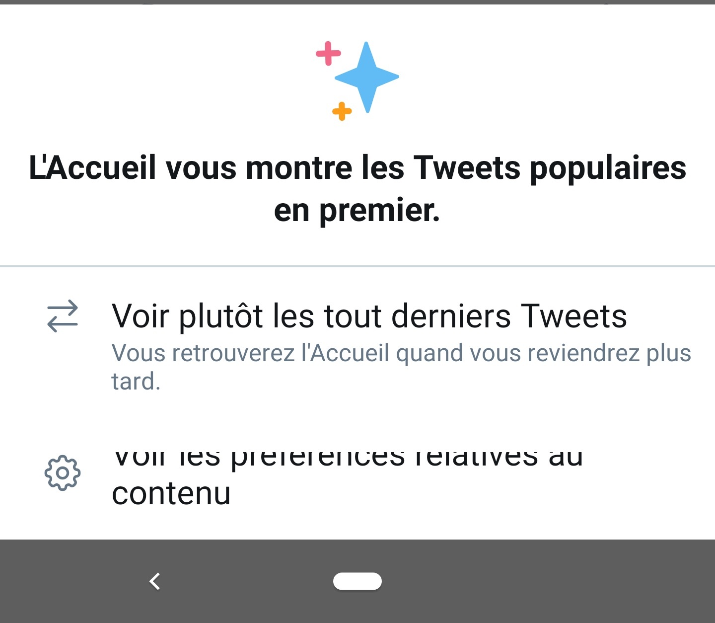 Si vous activez « montrer les derniers tweets », mais que vous ne revenez pas dans l’application pendant un certain temps, Twitter vous remettra automatiquement au paramètre « Accueil pour les tweets populaires » à votre retour. Dans ce cas, un court message apparaîtra à l’écran pour vous informer que vous êtes revenu au réglage Accueil. Twitter a annoncé la nouvelle fonctionnalité Android dans un tweet ce mardi :