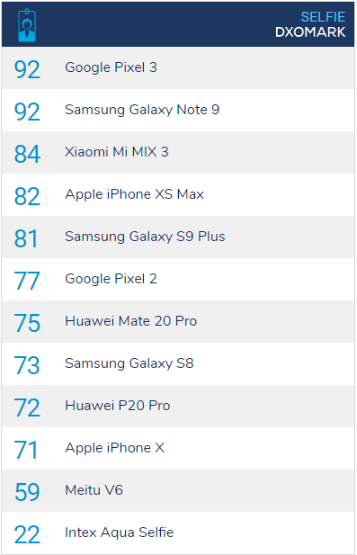 La première place est partagée par le Pixel 3 et le Galaxy Note 9, et le Xiaomi Mi Mix 3 prend la troisième place. L’actuel iPhone XS Max, le fleuron d’Apple, est plus loin derrière en quatrième position. Il est intéressant de noter que le Galaxy S9+ a un score beaucoup plus bas que le Galaxy Note 9 malgré un matériel identique. Selon DxOMark, le Pixel 3 de Google offre les meilleurs selfies, accentués par les meilleurs détails et textures (même au détriment du bruit). Le Galaxy Note 9 offre un look plus propre avec moins de bruit (et donc moins de détails), mais c’est le meilleur selfiephone pour la caméra avec un bon rendu des couleurs, une stabilisation et une excellente exposition du visage dans toutes les conditions. Le Xiaomi Mi Mix 3 a été récompensé pour ses autoportraits innovants.