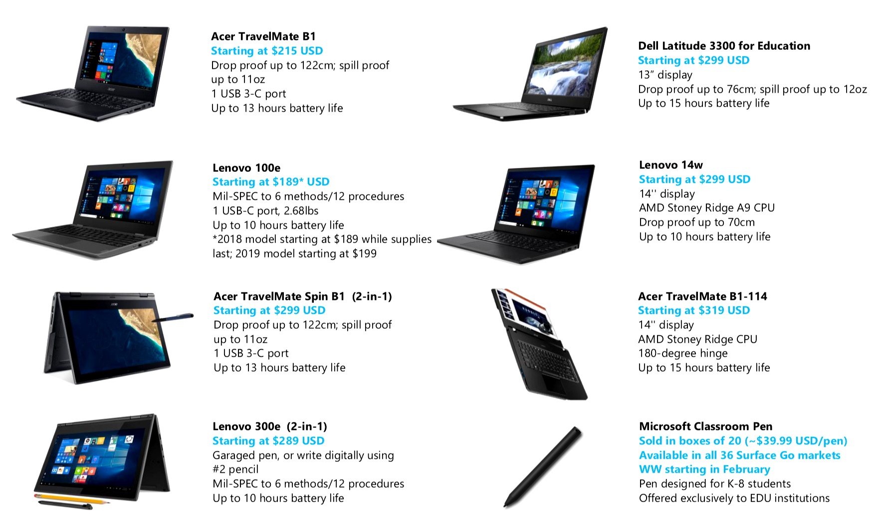 Comme l’année dernière, Microsoft lance une gamme d’appareils Windows 10 destinés au marché de l’éducation, dont un à 189 dollars. C’est un total de 7 périphériques qui sont présentés, dont 2 nouveaux périphériques 2-en-1 de Acer et de Lenovo dont le prix de départ est inférieur à 300 dollars. Acer, Dell et Lenovo proposent également des ordinateurs portables de 13 et 15 pouces plus abordables dans la gamme de 300 dollars.