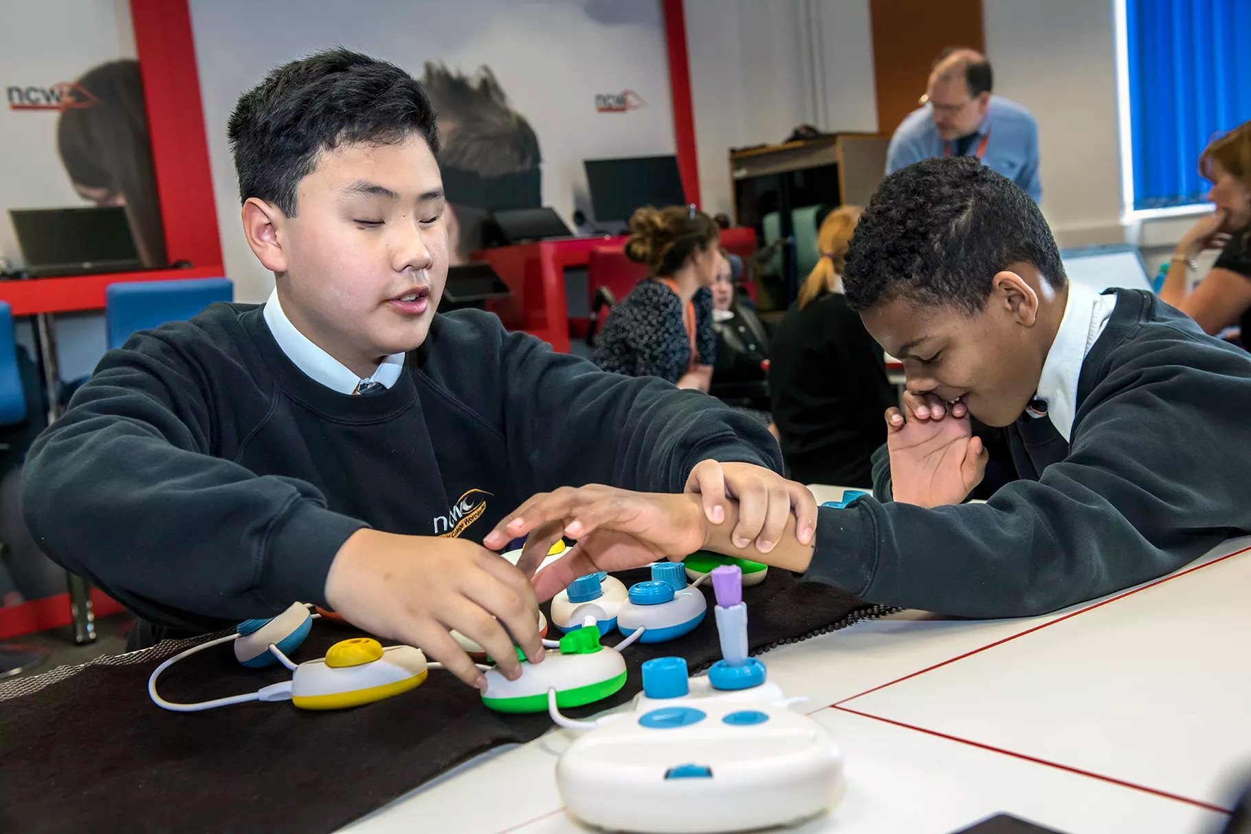C’est un appareil qui comporte des boutons et des fils reliant des cosses en plastique. Grâce à ces composants physiques, les étudiants aveugles sont capables de créer leurs propres programmes pour diverses fonctions telles que jouer de la musique et raconter des histoires. Chaque bloc a la taille d’une balle de softball et est coloré. Il existe différentes tailles pour différentes commandes et les enfants peuvent les connecter pour créer un programme.