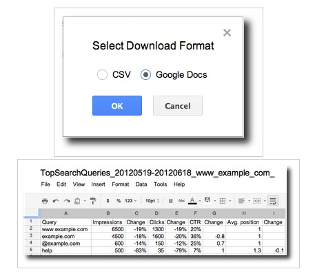 Comme vous pouvez le voir ci-dessus, une boite de dialogue s’ouvrira vous permettant de sélectionner entre “CSV” et “Google Docs”. La première option, va permettre le téléchargement des données au format CSV qui est disponible depuis un petit moment déjà depuis le Webmaster Tools. Ces données peuvent par la suite être importées dans des tableurs comme Excel, et autres. En revanche, l’arrivée de l’option Google Docs, vous permet d’enregistrer vos données dans une feuille de calcul Google.