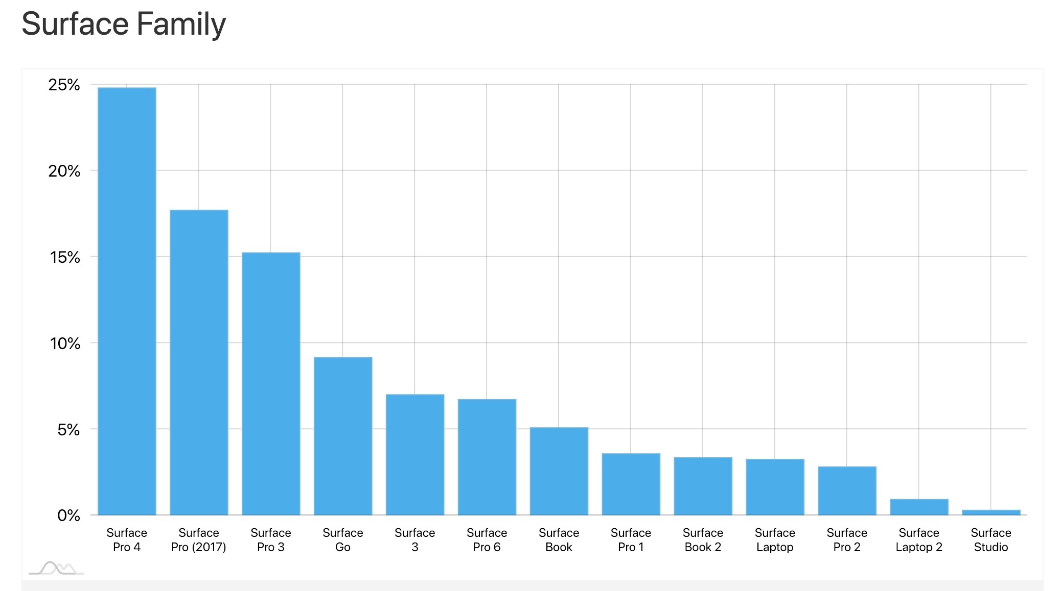 L’étude montre que la Surface Pro 4 conserve une part de 25 %, suivie de la Surface Pro avec 17 %. Le dernier-né de la gamme, la Surface Pro 6, se classe en 6e position, et ne détient qu’une part de 6 %.