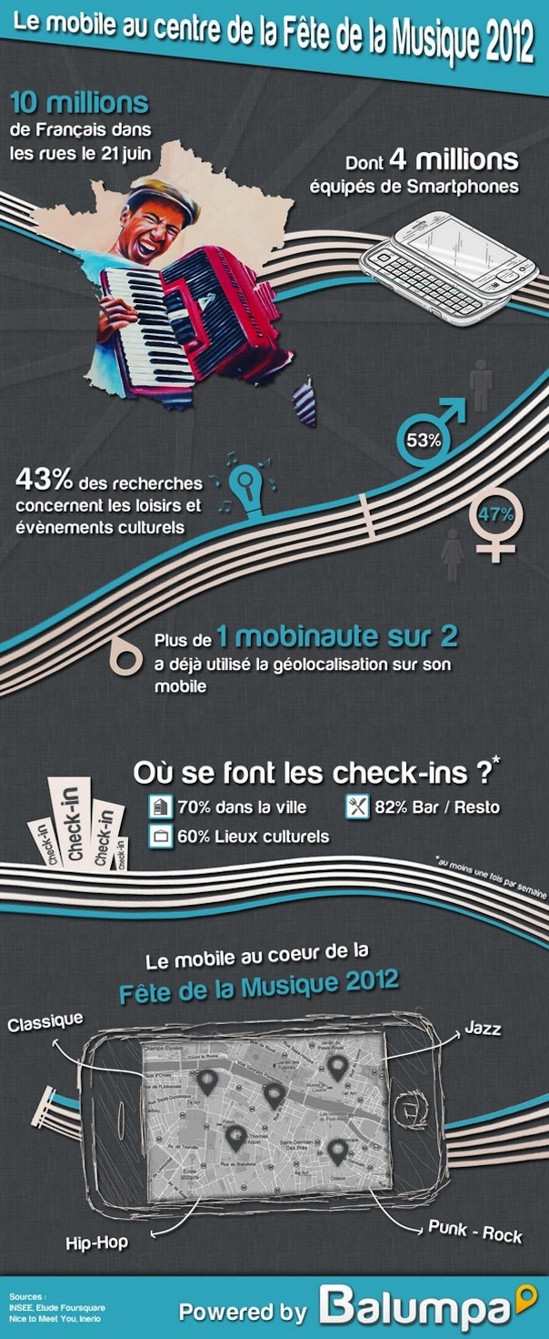 Ainsi, en cette journée supposée ensoleillée et de fête, si ce seront plus de 10 millions de Français qui vont se retrouver dans les rues de France ce 21 juin, se seront, selon Balumpa, 4 millions équipés de smartphones afin de nous faire vivre l’évènement au cœur des villes et des villages, permettant ainsi de découvrir tout style de musique.