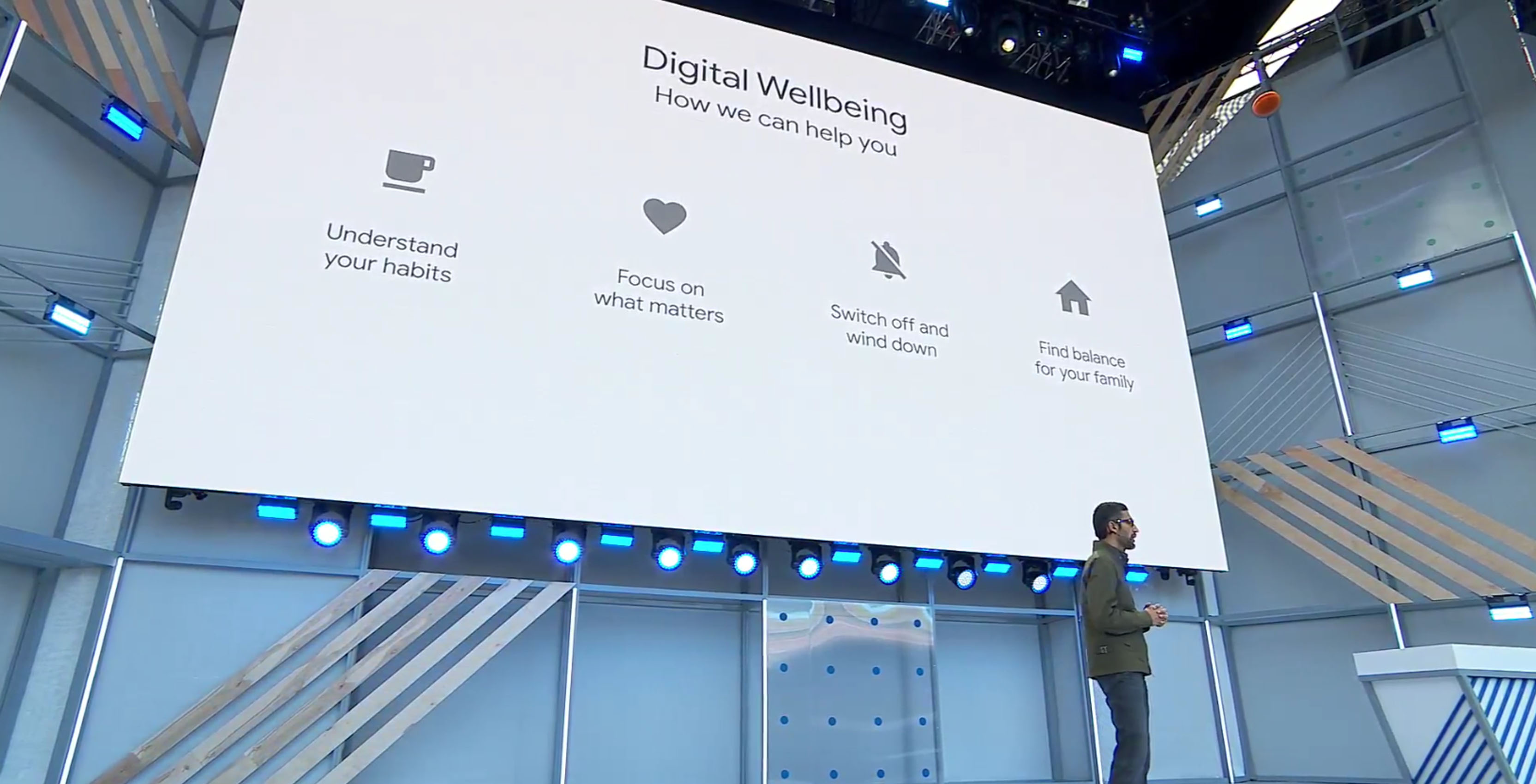 L’application « Bien-être numérique » est une fonctionnalité qui était initialement réservée aux smartphones Pixel sous Android 9. Elle s’est ensuite étendue sur les smartphones Android One. Cette fonctionnalité, analogue à « Temps d’écran » d’Apple, permet aux utilisateurs de gérer l’utilisation de leur smartphone en surveillant la durée d’utilisation des applications et en indiquant combien de fois le smartphone est déverrouillé et le nombre de notifications reçues. Il existe également un mode « Sommeil » qui modifie progressivement le smartphone en mode niveaux de gris et limite le nombre de notifications.