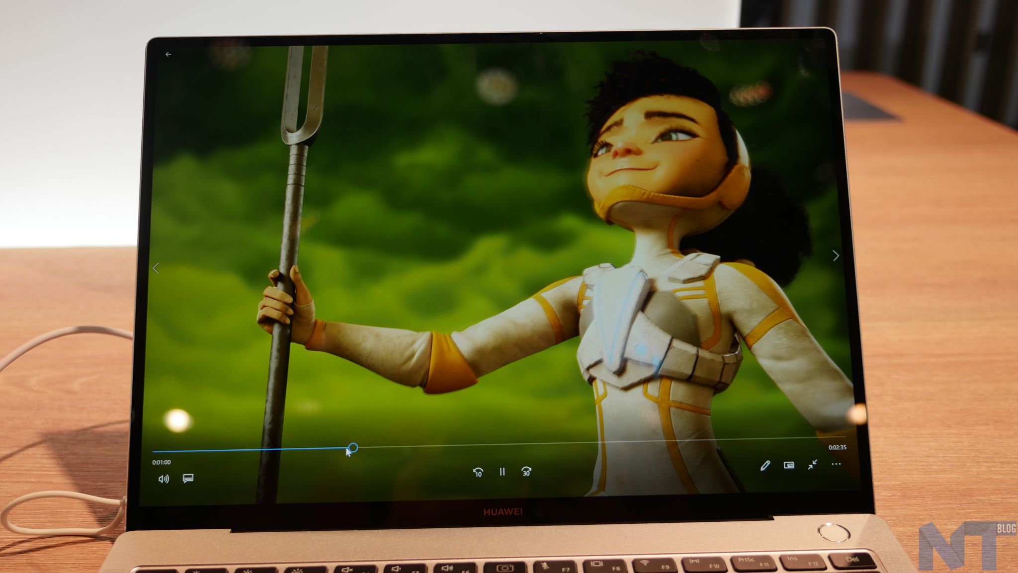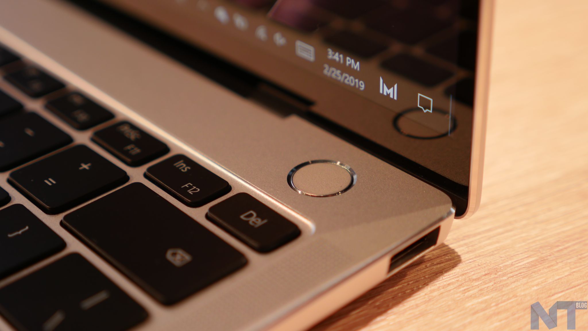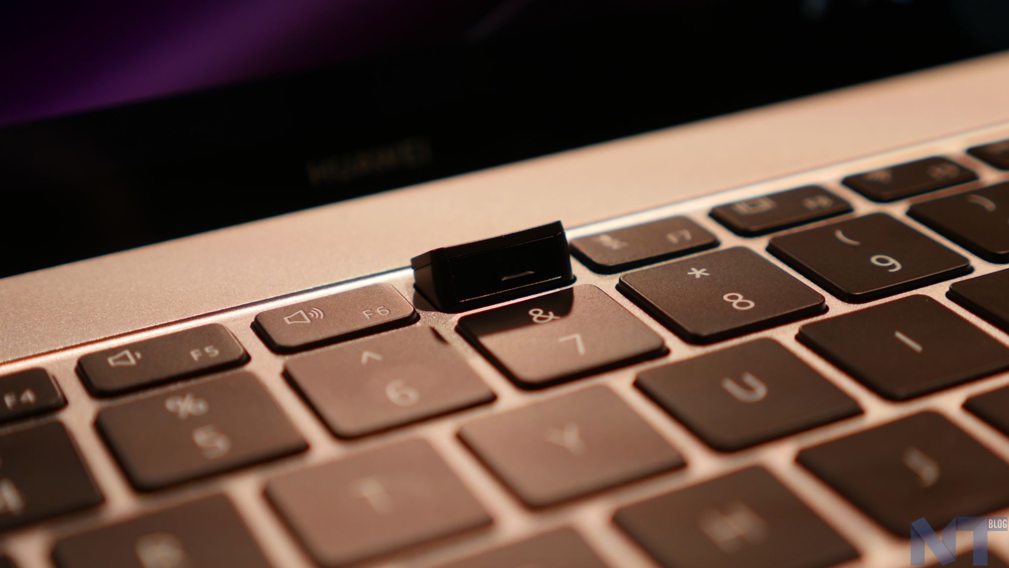 Le bouton d’alimentation sert également de capteur d’empreinte digitale et Huawei indique qu’avec une empreinte enregistrée, vous pouvez passer de l’écran de connexion au bureau en moins de 8 secondes. Cela fonctionne avec une puce de sécurité indépendante. La webcam, quant à elle, est toujours encastrée dans la rangée de touches de fonction du clavier, ce qui contribue à maintenir l’encombrement de l’écran et à favoriser la confidentialité.