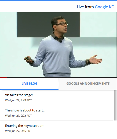 - Keynote en flux direct : Le flux de la keynote Google I/O en direct depuis votre blog ou votre site Web
