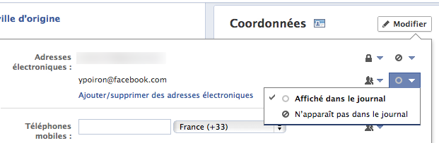 Il suffit d’éditer les paramètres de votre contact et choisir “N’apparaît pas dans le journal” pour votre e-mail Facebook, puis choisissez l’adresse électronique que vous souhaitez modifier à “Affiché dans le journal”.