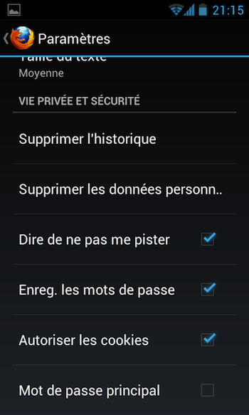 En ce qui concerne la vie privée, la nouvelle version de Firefox pour Android suit les traces de son grand frère puisqu’elle inclue des fonctionnalités telles que dire de ne pas me pister, inclure un mot de passe principal, et tous les autres caractéristiques liées à la vie privée qui devraient être la norme dans tous les navigateurs Web maintenant.
