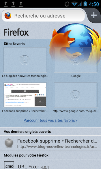 Le nouveau navigateur est aussi plus rapide. Si je n’ai pas fais directement un article hier soir suite à l’annonce de Mozilla, c’était tout simplement pour tester le navigateur. Si pour mes premiers tests certes j’ai remarqué une augmentation important sur le chargement des images, le chargement des pages était encore le même qu’auparavant, cela était dû à une connexion 3G faible. En effet, dès que je me suis mis sur le WiFi de suite j’ai pu bénéficier d’une expérience fluide.