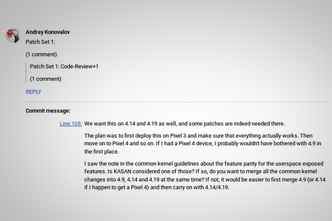 Cette fois-ci, nous obtenons encore moins d’informations qu’en février : le fil dans lequel ce commentaire apparaît concerne simplement la résolution d’un problème dans le noyau Linux d’Android. Ce patch est apparemment testé sur un Pixel 3 d’abord dans le but de le tester également sur son successeur.