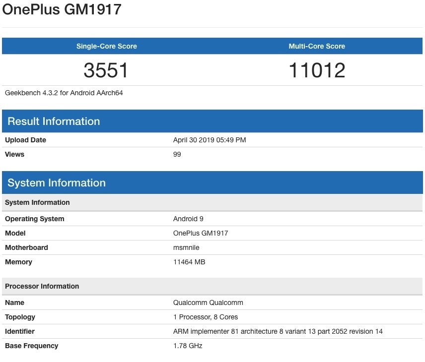 Geekbench répertorie le OnePlus GM1917 en tant que smartphone équipé du processeur Snapdragon 855 de Qualcomm avec 12 Go de RAM. Il s’est vu attribuer un score mono-cœur de 3 526 points, tandis que les tests multi-cœurs font passer son score à 11 101 points.