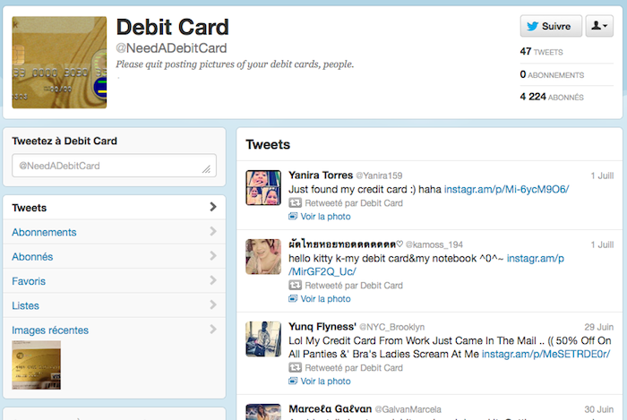 Comme vous pouvez le lire sur le tweet ci-dessus, un compte Twitter nommé @NeedADebitCard est tout simplement à la recherche sur Twitter des gens qui entrent dans la catégorie : “quelque-chose de bien m’arrive, je partage !”. Sauf qu’ici on ne parle pas d’une photo d’un lama vu en pleine ville, ou encore de la réincarnation de Dark Vador, mais plutôt des personnes qui ont trouvé, retrouvé, obtenu leur carte de crédit, et ressenti le besoin de la partager avec tout le monde … et bien sûr y inclure une photo ! Ça ne s’arrête pas là, puisqu’il ne s’agit pas seulement d’une image, mais bien d’une photo qui montre tous les détails de leur compte.