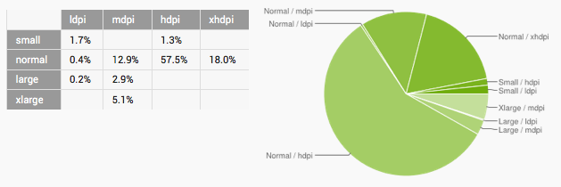 Le reste des statistiques fournies sont intéressantes puisqu’elles comprennent l’augmentation relative dans le temps des différents systèmes d’exploitation Android et une répartition par tailles de l’écran. Il semblerait que la plupart des appareils Android (57,5%) sont équipés d’un écran normal HDPI.
