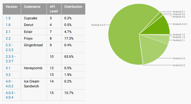 Les derniers chiffres en matière de distribution Android montre qu’Android 2.3.3 (Gingerbread) est toujours la version la plus populaire de l’OS avec 63,6% du marché. Cela peut-être expliqué par le fait que la plupart des consommateurs sont encore dans la période de contrat de deux ans, et doivent donc faire avec leur téléphone actuel. Si certains ont eu la chance de voir leur smartphone migrer à la dernière version d’Android, Ice Cream Sandwich, d’autres n’ont pas cette chance, bloqués par les opérateurs qui ne se fatiguent pas pour pousser celle-ci.
