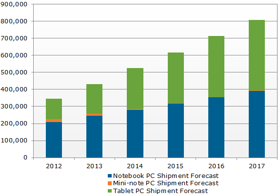 Selon les données de NPD, 208 millions d’ordinateurs portables seront vendus en 2012, comparativement au 121 millions de tablettes, pour la plupart des iPads. En 2017, ils s’attendent à ce que les ventes d’ordinateurs portables rapportent 393 millions d’euros, alors que les tablettes se verraient croître à 416 millions d’euros. Selon les auteurs du rapport, un facteur clé dans la croissance des ventes de tablettes, réside dans des marchés matures comme l’Amérique du Nord, le Japon et l’Europe occidentale, où la pénétration des portables est élevée, mais que celle des tablettes est significativement plus faible.