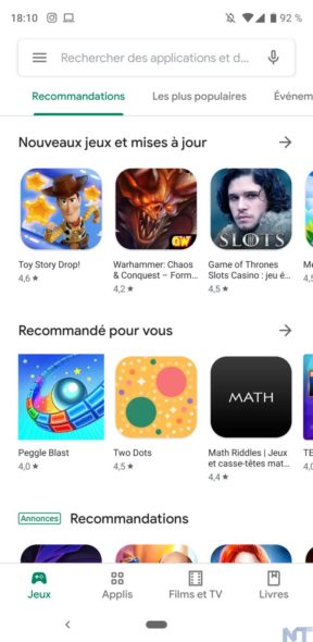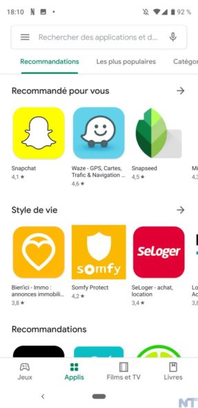 Comme mentionné, l’application Google Play Store a maintenant un fond entièrement blanc, mais ce n’est que l’un des multiples changements. En effet, on retrouve également des onglets en bas pour les jeux, les applications, les films et les séries TV, et les livres. En outre, il n’y a pas d’onglet Musique pour le Play Store, probablement parce que Google Play Music est remplacé par YouTube Music.