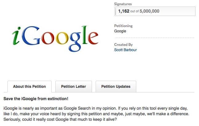 Qui plus est, huit pétitions ont été créées sur change.org dans l’espoir de convaincre Google de ne pas fermer iGoogle. À ce jour, la plus populaire a déjà atteint 1 162 signatures, et son objectif incroyablement ambitieux est de 5 000 000 signatures… Si cet objectif semble irréaliste, il ne l’est peut-être pas tant que ça étant donné qu’iGoogle ne sera pas fermé avant 17 mois… Qui sait, peut-être que les utilisateurs mécontents seront assez pour se regrouper et se rapprocher pour atteindre ce but !