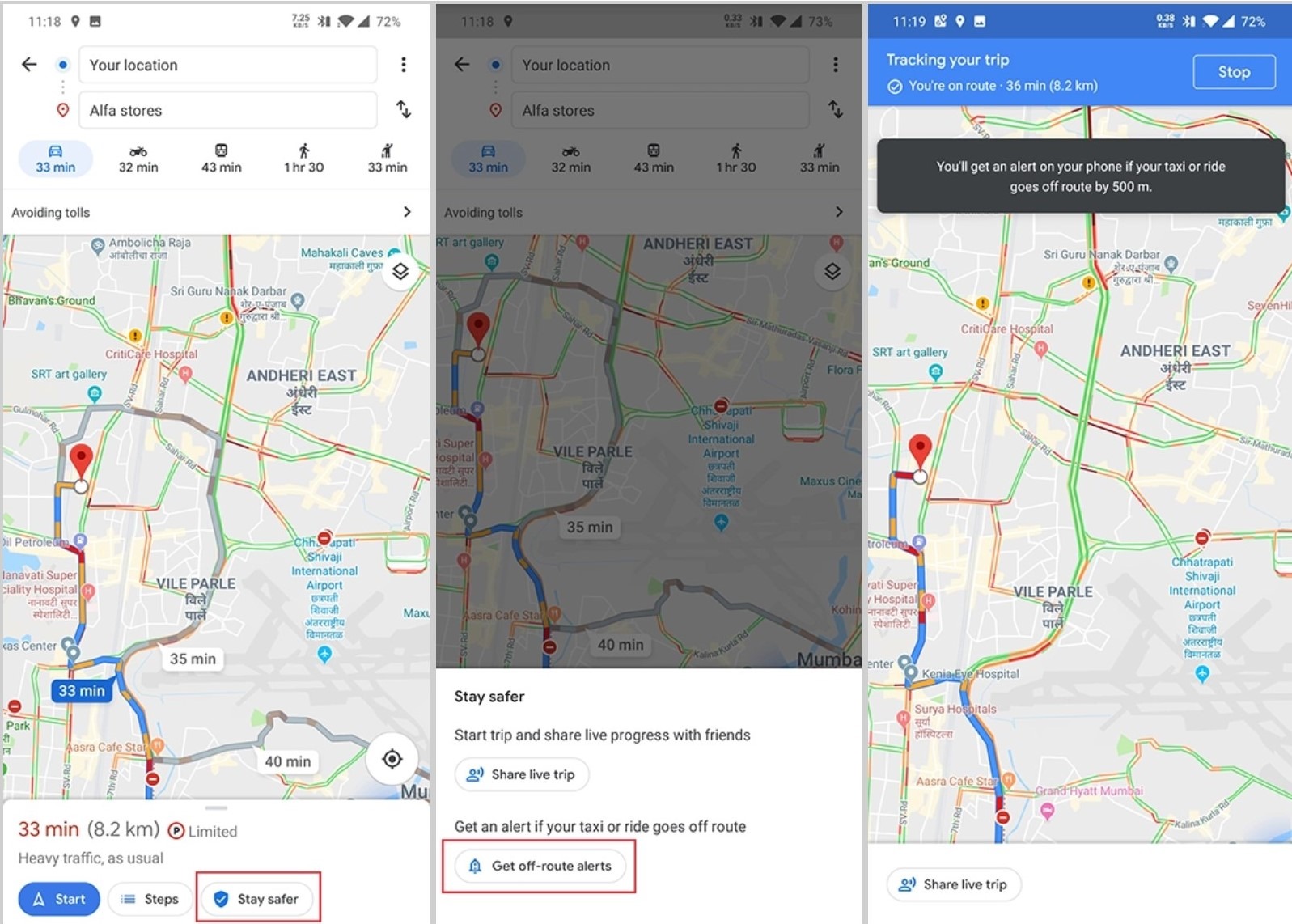 Des « alertes en dehors des itinéraires » sont disponibles dans le menu « Restez en sécurité ». Ce dernier est accessible après avoir sélectionné votre destination, mais avant de passer en mode navigation. De la manière dont Google attribue cette option, il est clair que les alertes en dehors des itinéraires sont censées être une fonction de sécurité, agissant comme un signal d’avertissement si un chauffeur de taxi ne vous emmène pas directement à votre destination pour une raison quelconque.