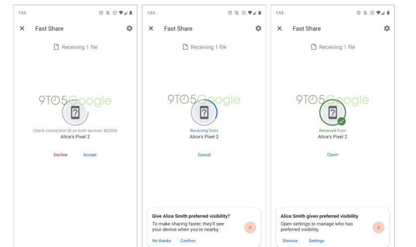 9to5Google rapporte avoir découvert une fonctionnalité Fast Share qui s’apparente pratiquement à AirDrop pour Android. Elle utilise le Bluetooth pour détecter les appareils à proximité et établir une connexion, puis utilise le Wi-Fi pour transférer les données. La capture d’écran montre qu’elle peut au moins détecter les Chromebooks, les iPhone et les smartwatches à porter également.
