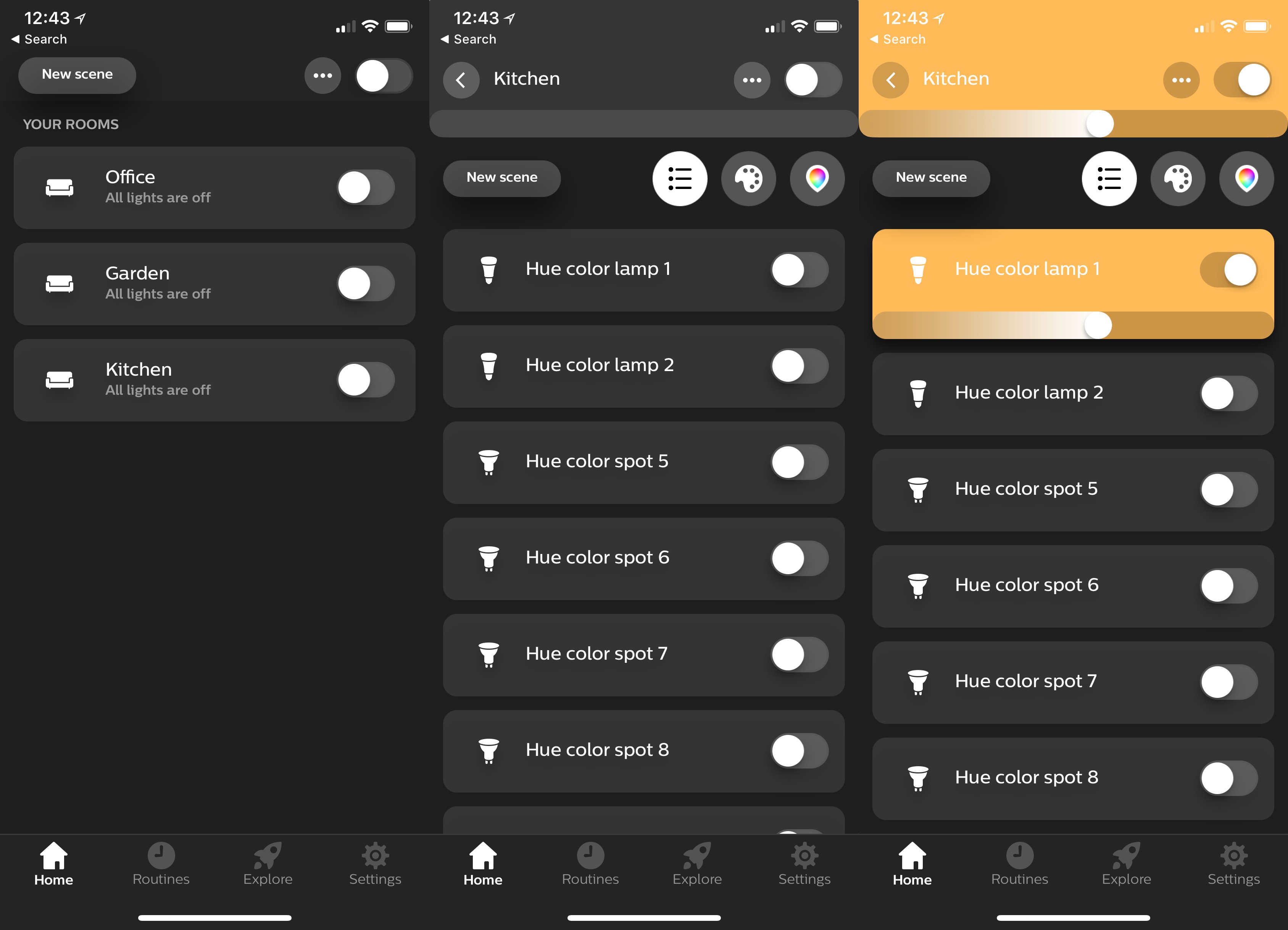 La pièce apparaît maintenant sur la page principale. Vous pouvez l’activer ou la désactiver et régler les scènes et les lumières comme avant. Cependant, elle contrôle maintenant toutes les lumières que vous avez affectées à cette pièce. Une astuce amusante consiste à créer plusieurs « pièces » pour une seule partie de votre maison.