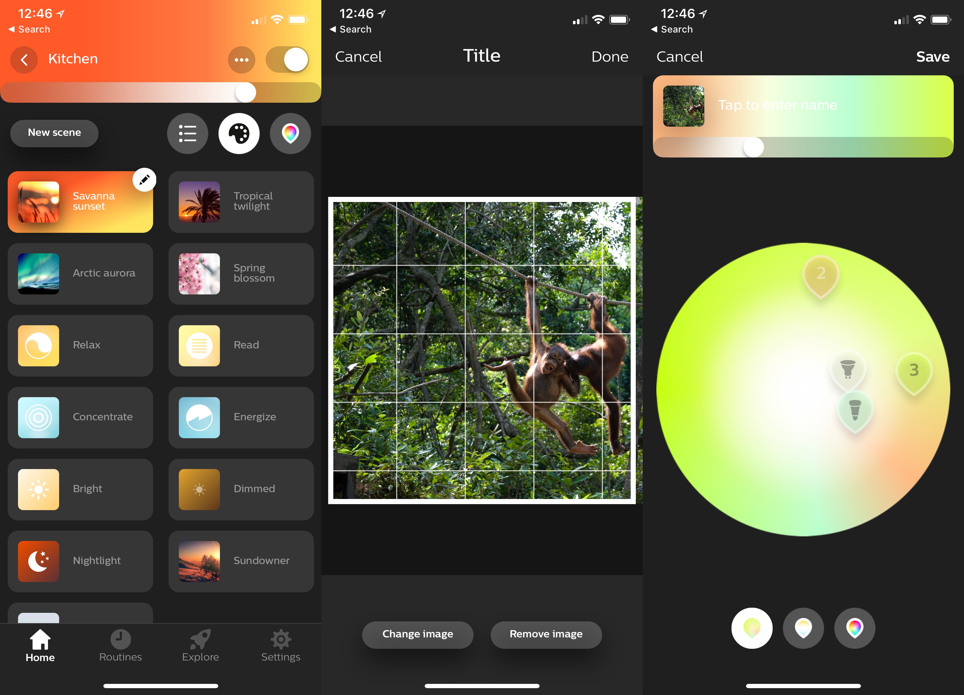 Les scénarios de l’application Hue sont des préréglages que vous créez et personnalisez. Cela permet de changer rapidement vos couleurs préférées, atténuer les lumières au besoin ou même tout laisser passer en mode veilleuse. Leur création est super facile.