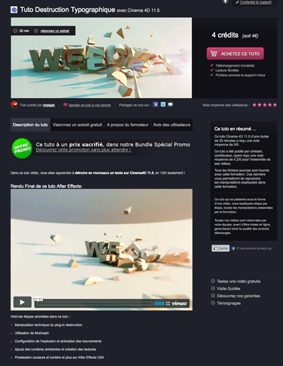 Passionné et certainement aussi un poil “geek”, vous allez pouvoir être accompagné dans votre apprentissage grâce à des vidéos de qualité, réalisées par des experts, professionnels ou amateurs éclairés. Les contenus sont sélectionnés à la main, avec beaucoup d’amour et de professionnalisme, avant d’être mis en ligne. Chaque vidéo est classée selon sa famille (graphisme, vidéo, 3D, programmation etc…) et le ou les logiciels utilisés.
