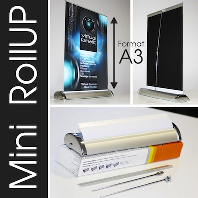 Le second lot proposé est un mini RollUp de bureau. Ce mini RollUp, totem enrouleur, A3, est ultra léger, facile et rapide à monter.