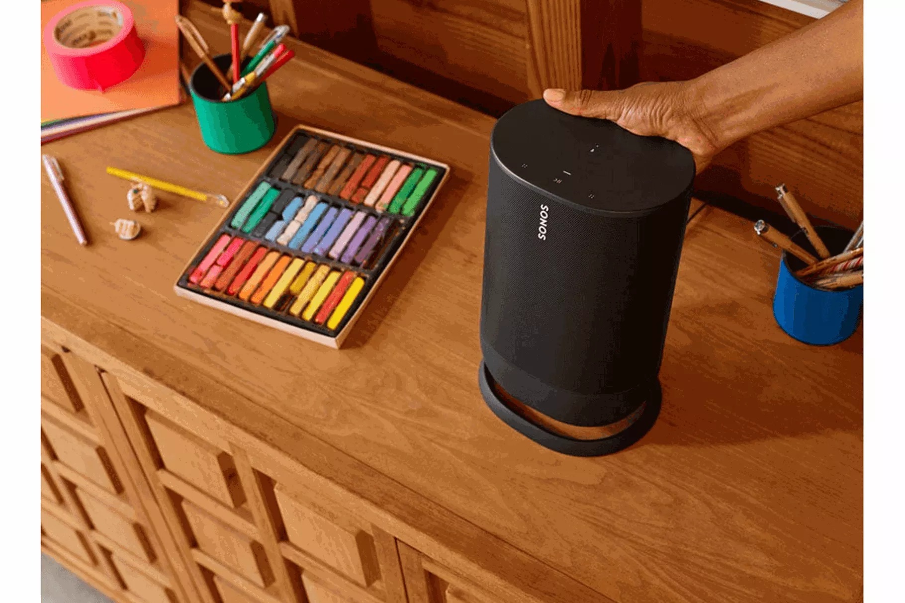 Nous avons également un premier aperçu de la charge de la Sonos Move, à l’aide du port USB-C ou les deux contacts de charge situés près de la base de l’enceinte. Il s’agit d’une conception intelligente qui vous permet d’étendre votre écosystème audio Sonos dans le jardin ou dans la salle de bain, par exemple, ou à des endroits bien au-delà de la portée de votre signal Wi-Fi comme la plage ou un parc.