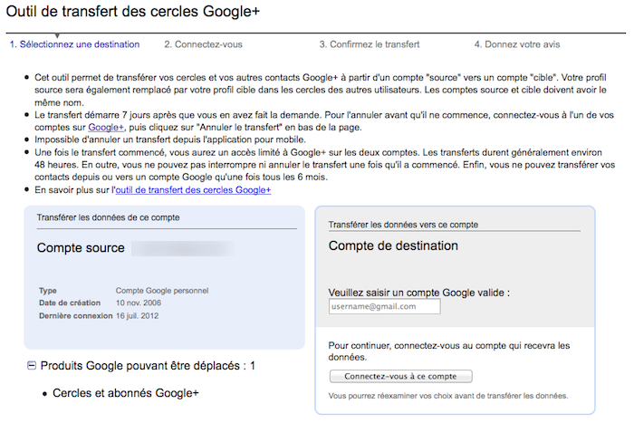 Une fois sur le service, cliquez sur le lien “Transférez vos contacts Google+ vers un autre compte”. De là, vous allez être redirigé vers une page d’authentification. Veuillez bien noter qu’il s’agit du compte “source” que vous choisissez, autrement dit le compte Google+ qui va être migré vers le nouveau. Le compte de “destination” sera défini par la suite.