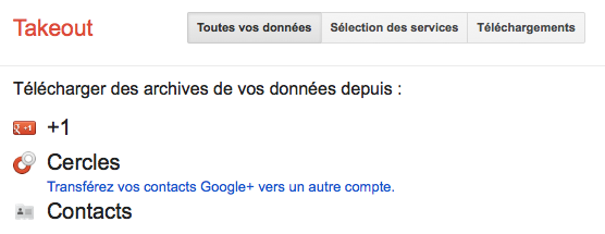 Pour ce faire, rendez-vous sur la page Google Takeout, qui jusque là permettait de télécharger vos données en provenance des différents services de Google offre donc également la possibilité de transférer les contacts d’un compte Google+ à un autre. Pratique !