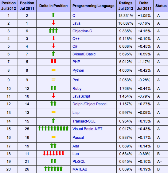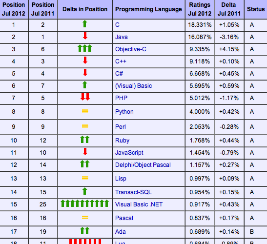 Voici les vingts premiers langages de programmation de juillet 2012. Il y a quelques surprises au-delà de hausse et de la célébrité de l’Objective-C, comme l’étrange saut de Visual Basic .NET de la vingt-cinquième place à la quinzième.