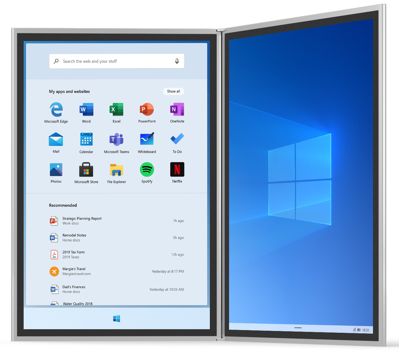 Microsoft a donné quelques exemples pour montrer que Windows 10X est toujours Windows 10. Il y a toujours un menu Démarrer, bien que le design ait été modifié pour passer d’un panneau à l’autre, et il est mieux optimisé pour le tactile et peut réagir à la posture de votre appareil. Il vous donne une liste d’applications, de documents et de fichiers pour un accès facile. En d’autres termes, il ressemble beaucoup plus à la façon dont les smartphones et les tablettes fonctionnent aujourd’hui.