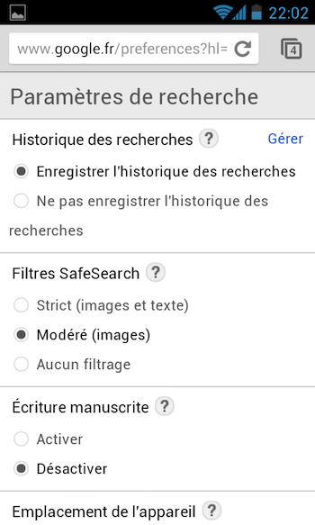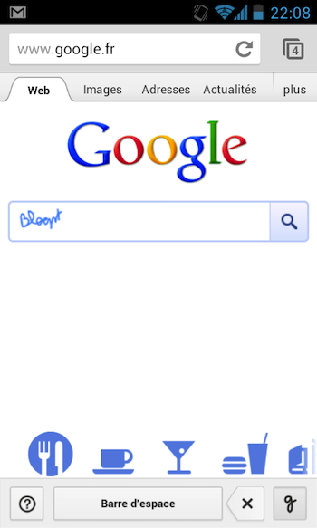 Pour activer la fonction, appuyez sur le lien “Paramètres” en bas de la page Google.fr depuis votre navigateur mobile. De là, descendez jusqu’à la partie “Écriture manuscrite”, et activez l’option. Une fois que vous avez sauvé ce paramétrage, en bas de la page, vous devriez être redirigé vers la page d’accueil avec un joli message vous indiquant de commencer à écrire. Voici quelques captures que j’ai pu faire depuis mon smartphone :