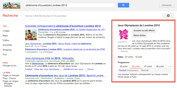Enfin, dernier petit aspect notable si vous cliquez sur le doodle vous serez redirigé vers la recherche Google, avec outre le fait de proposer les résultats, propose sur le côté droit de la page un affichage interactif qui présente un calendrier et les résultats officiels de tous les sports des Jeux Olympiques de Londres 2012 !
