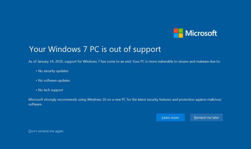 À partir du 15 janvier 2020, un avertissement en plein écran apparaîtra sur l’écran des utilisateurs de Windows 7 leur indiquant pourquoi ils doivent passer à Windows 10. Cette date n’a pas été choisie au hasard et coïncide avec la fin du support officiel de Windows 7 le 14 janvier. Après cette date, le système d’exploitation ne recevra plus de correctifs de sécurité, même critiques, à moins que vous ne payiez pour une licence de support étendu.