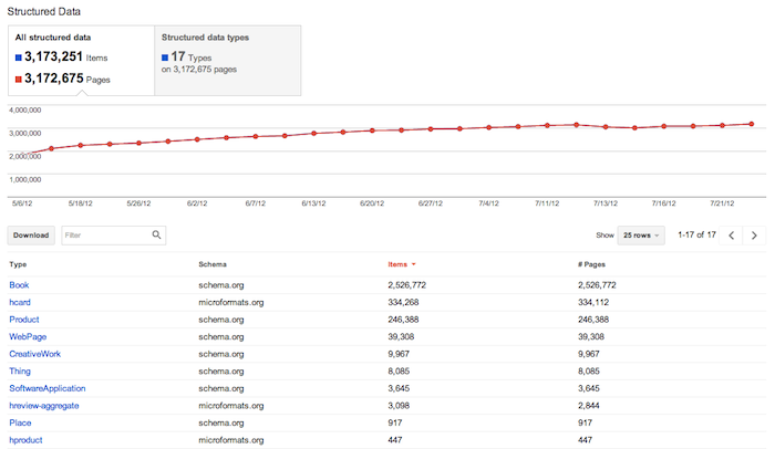 La première est au niveau de la vue du site, qui agrège les données par type d’éléments et les schémas reconnus. “Root item type means an item that is not an attribute of another on the same page”, explique l’équipe de Google Webmaster Tools. Par exemple, le site utilisé dans la capture ci-dessous a environ 2 millions d’annotations Schema.Org pour le terme “Books” (http://schema.org/Book).